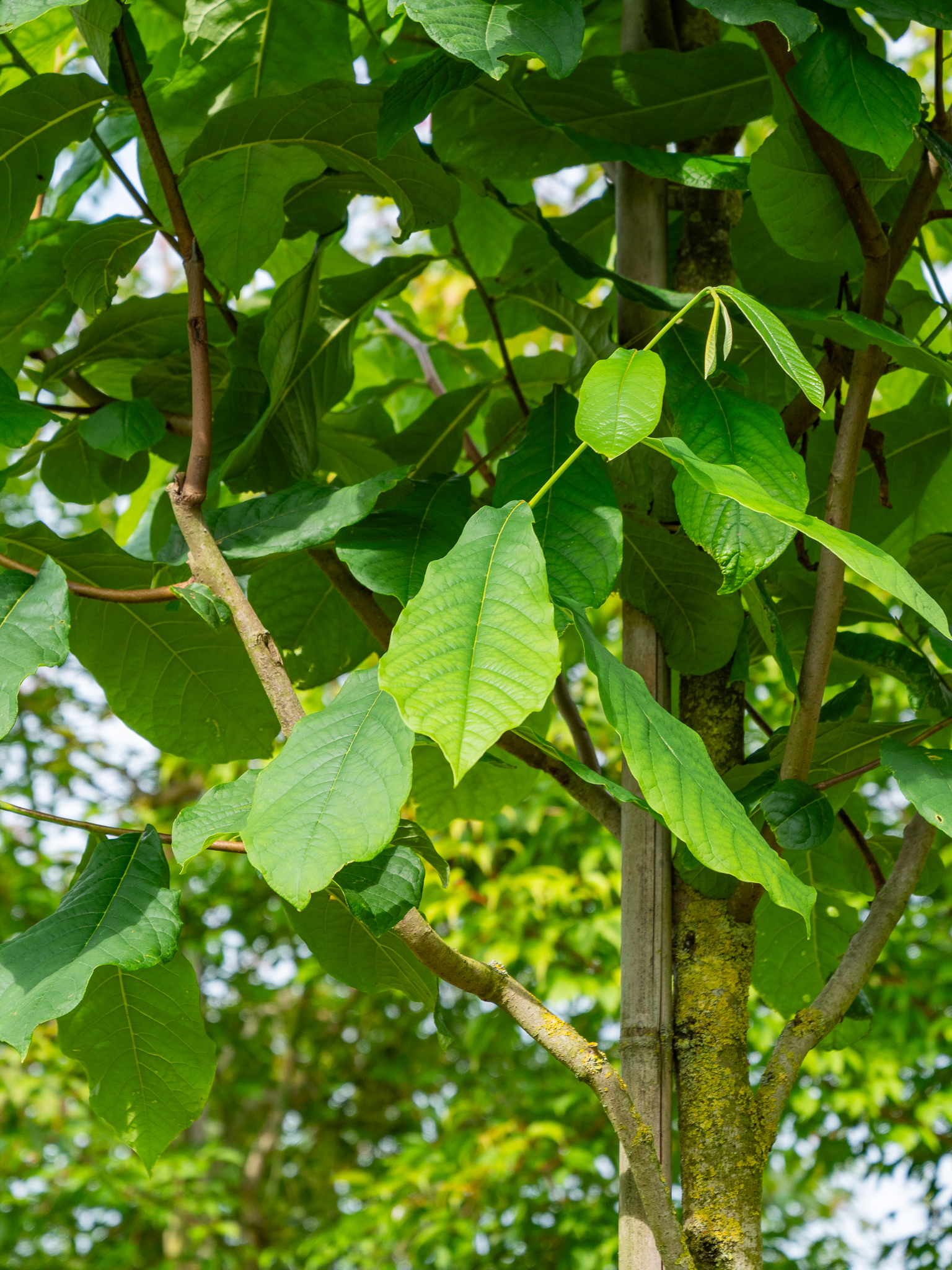 Asimina triloba is a small tree with a regular pyramidal crown up to about 6 m in height. Although the tree does not branch extremely densely, the relatively large leaves give the crown a full and compact appearance. The young twigs are light brown, the old bark is darker brown to grey-brown and flakes off roughly in small plates. The prominent, large leaves are inverted ovoid to oblong inverted ovoid. When unfurling and in summer they are bright green. In autumn, they turn a deep golden yellow before falling off. The flowers open just after leaf sprouting, around the beginning of May. The single flowers appear in the leaf axils of the leaves, which largely hide the flowers from view. The flowers are typically triangular in shape and purple-brown. After pollination, the fruits are formed, which hang together in bundles of three to six. These are oval to broadly oblong and light green to yellow-green but often covered with a very thin layer of wax, giving them a slightly blue haze.