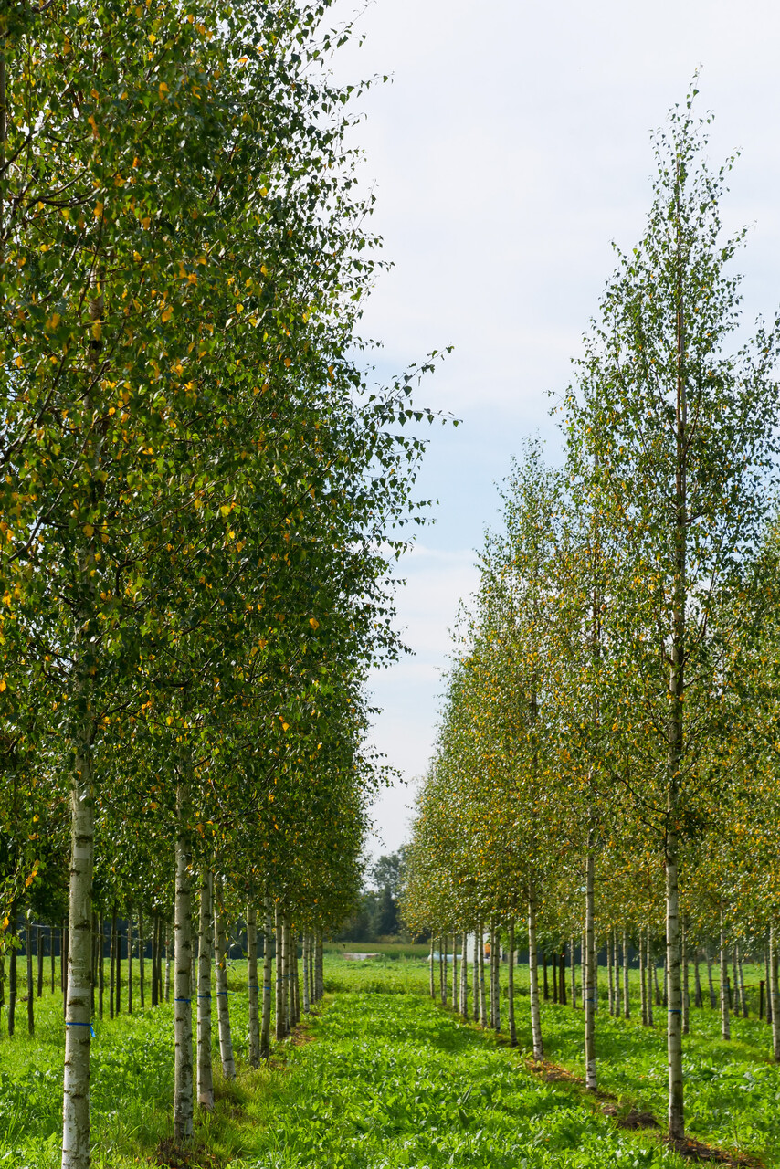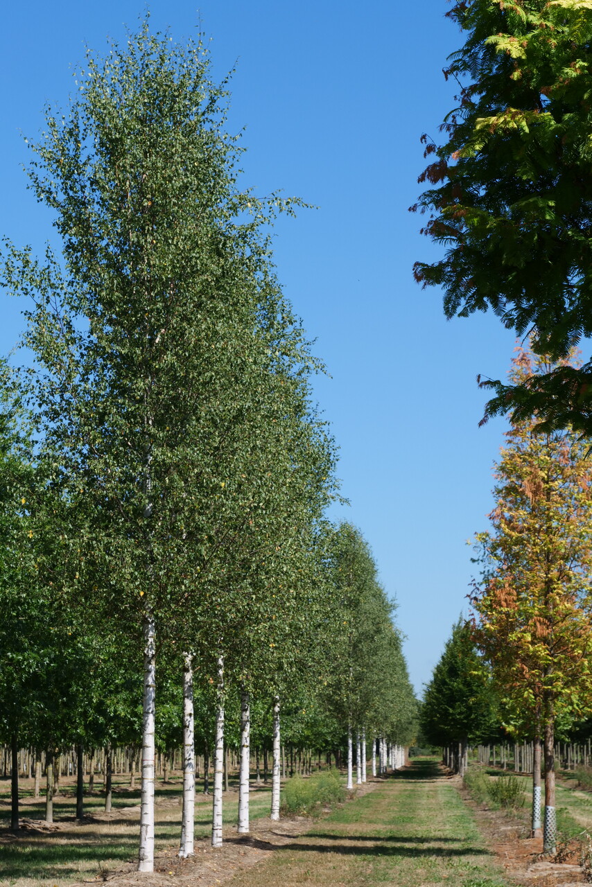 Medium-size tree with healthy, vigorous growth: has a slender, narrowly pyramidal crown. First year twigs dark brown, older bark white to grey-white. The bark is only slightly peeling: only older trees acquire a grooved trunk base. Forms a nicely vertical main stem with the branches growing from the central leader at an angle of about 45°. The glossy, fresh green leaf turns golden yellow in autumn. Due to the narrowly pyramidal crown, good anchoring and fairly light side branches, the tree is highly suitable for avenues and streets. Also very useful in landscape planting. Was discovered in Switzerland by Sjef van Roessel and introduced after extensive testing.