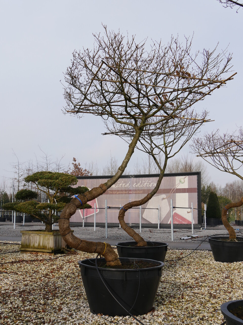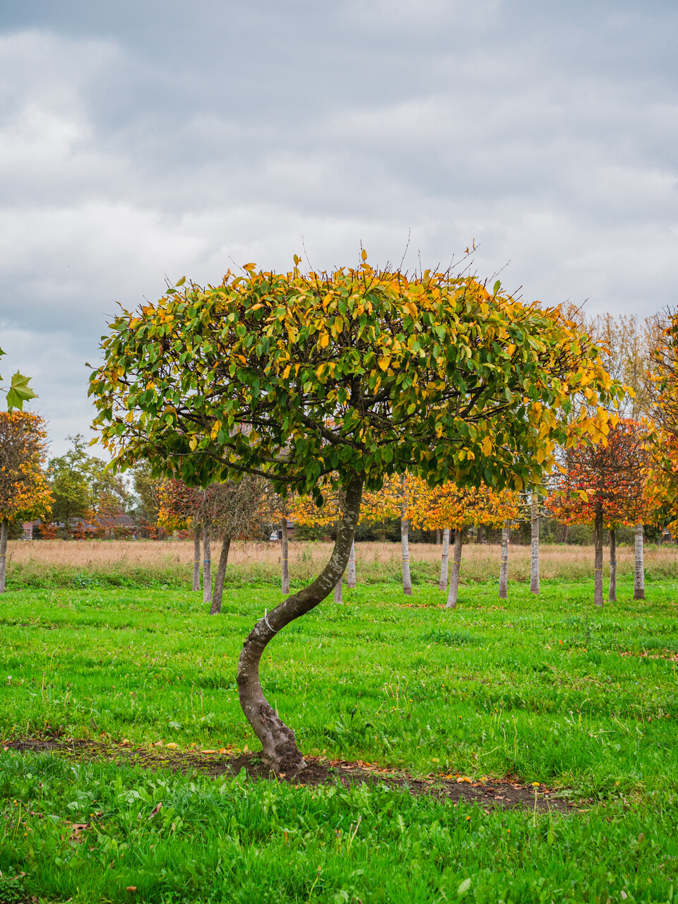 THE SWING trees are grown in Platanus x hispanica (plane tree) and Carpinus betulus (hornbeam) as both are valued topiary trees and fit into many designs. Since autumn 2020, Parrotia persica (Persian ironwood), which colours so beautifully in autumn, has also been added to the range. THE SWING trees are patented and exclusively available from Van den Berk Nurseries.