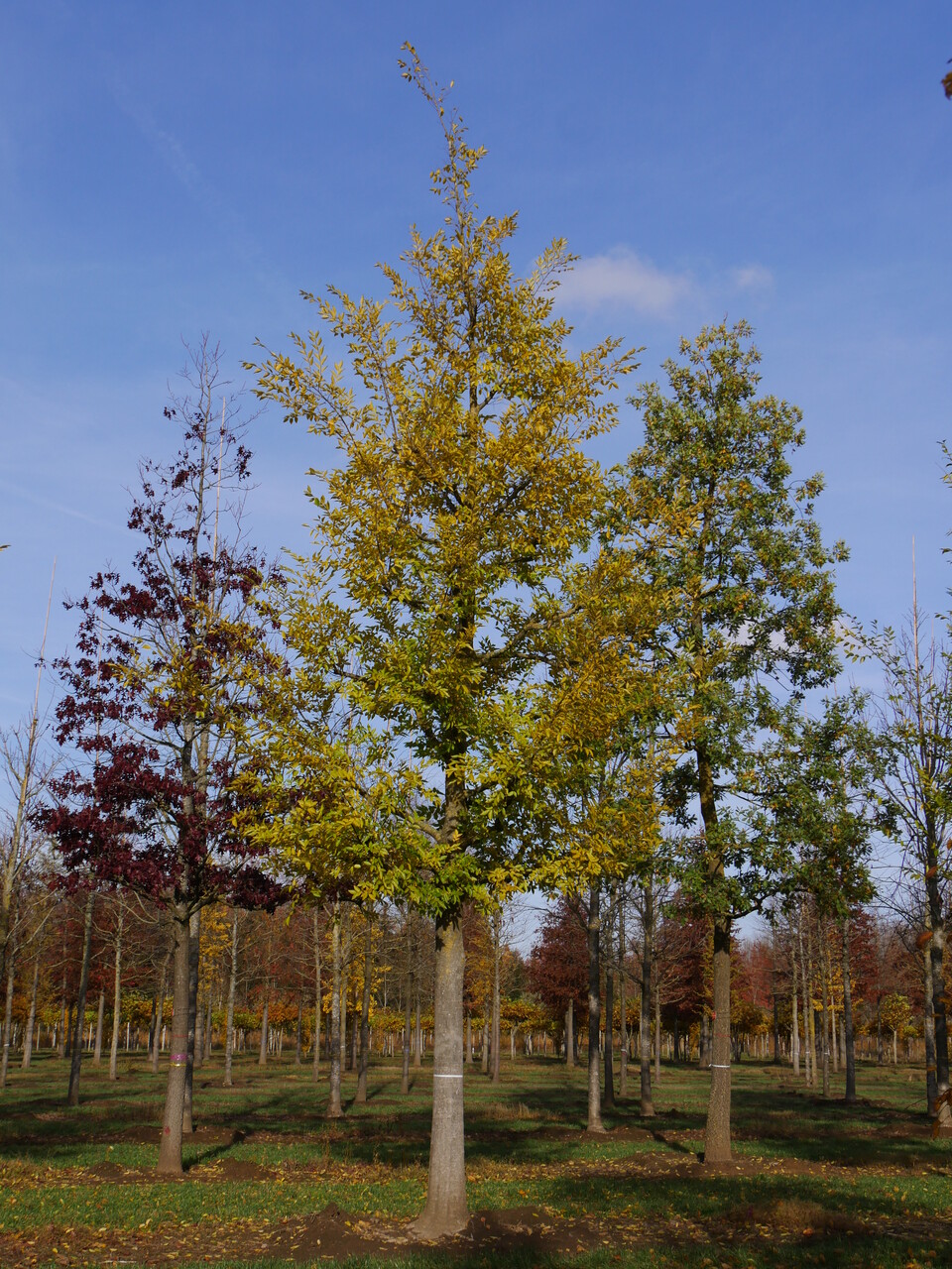 Fast growing, large tree with a fairly loose, umbel-shaped crown. The long, projecting and overhanging first-year twigs give the tree an elegant appearance. The twigs are dark brown, turning grey later. The leaves vary in shape from ovate to elliptical or obovate. The leaf’s underside has yellow to orange-yellow hairs, sometimes only on the veins. The inconspicuous flowers are followed by purple to orange, round drupes. Prefers warm summers. Prefers well-drained soil. Can tolerate drought and air pollution.