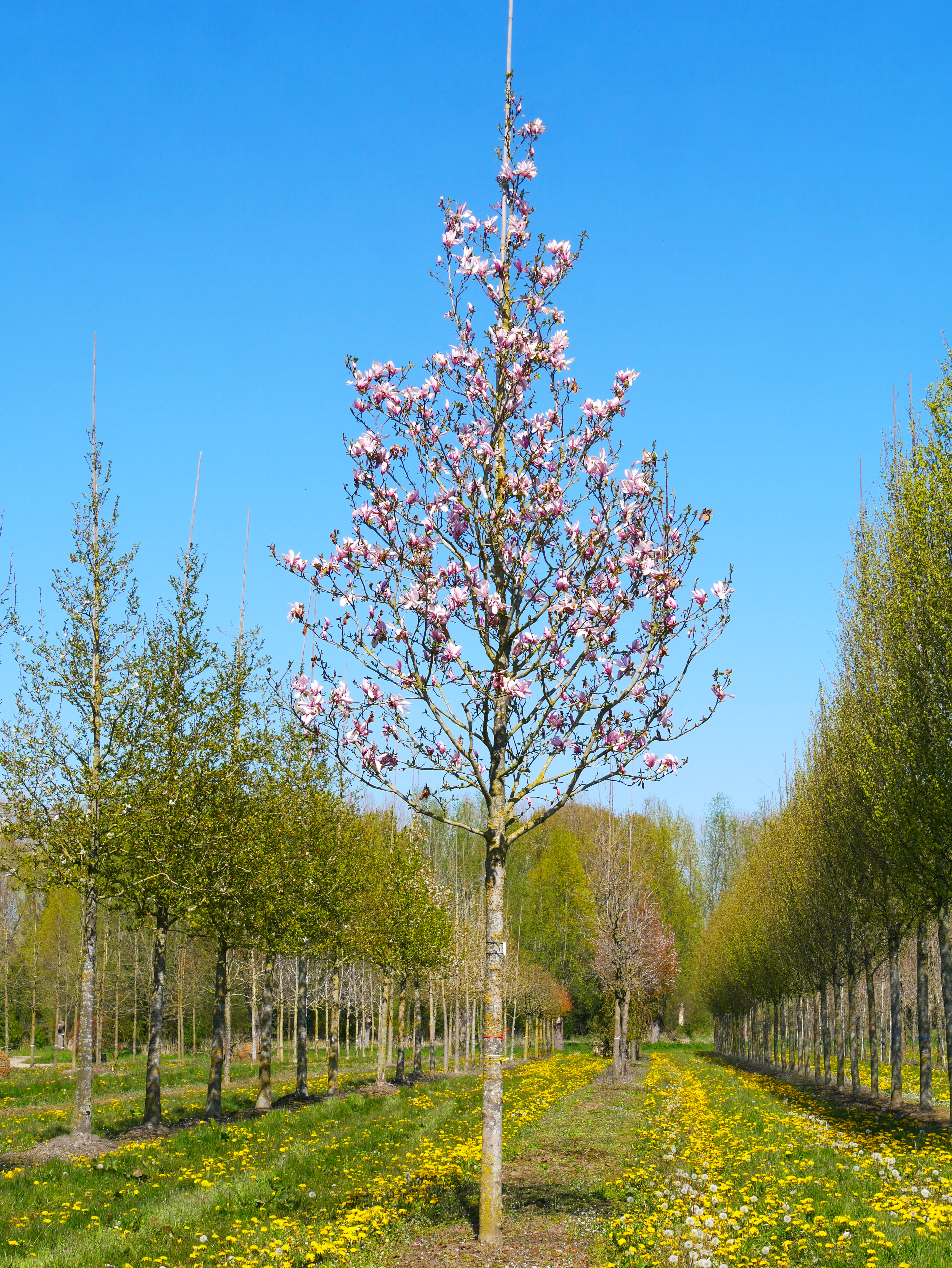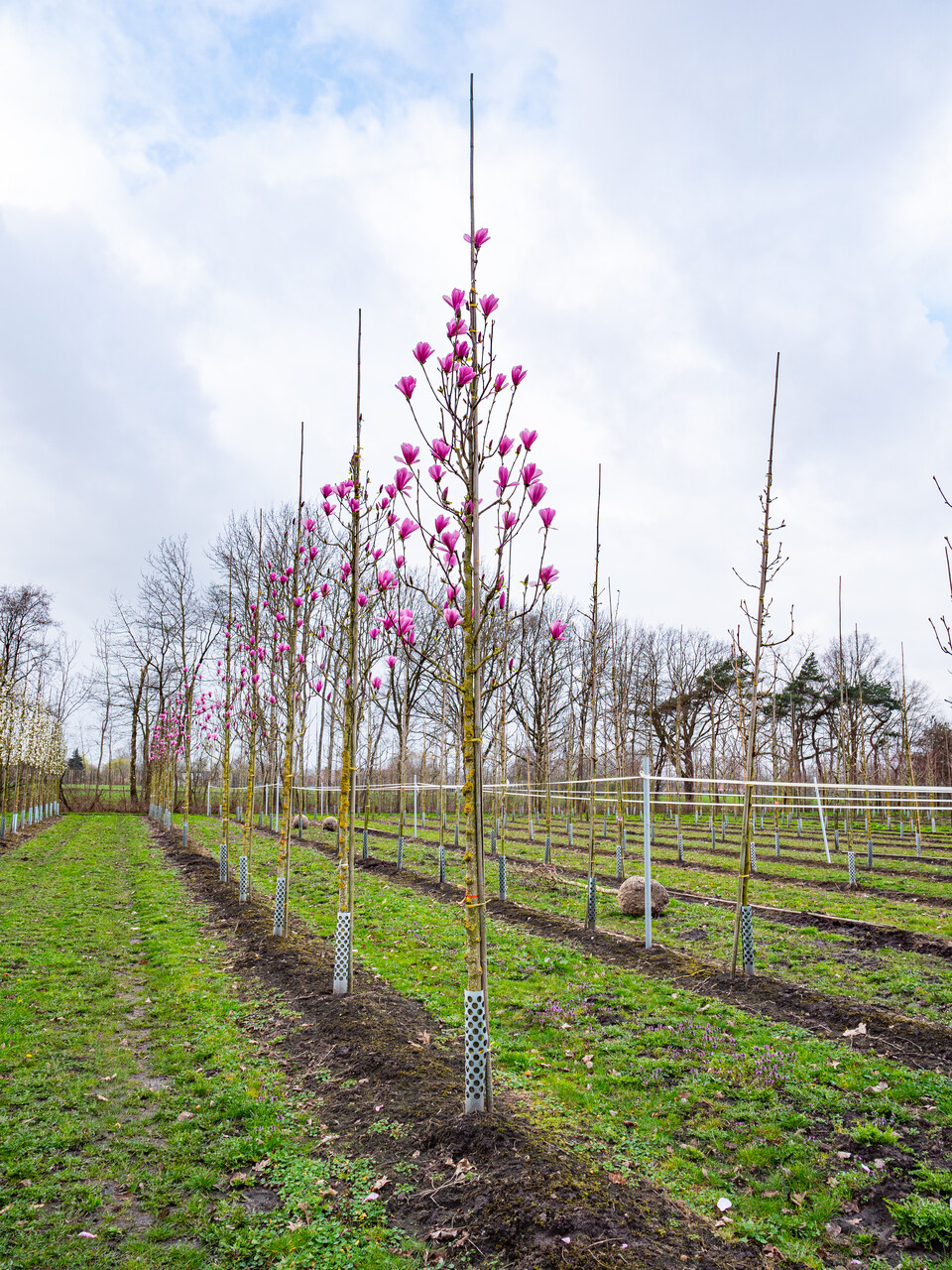 Medium-size tree, initially with a regular, ovoid crown and a straight central leader. The crown later becomes almost round, with an eventual height of about 9 m. The flower buds only develop in spring, so they cannot freeze in the winter. The large flowers open around late April. The flower buds are a deep reddish purple. The opened flowers are deep pinkish purple on the outside and clearly lighter on the inside. They retain a narrow tulip shape for a long time, but eventually open to a broad saucer shape. Good tree for use in housing estates and on squares, thanks also to the pronounced colours and profuse blossoming.