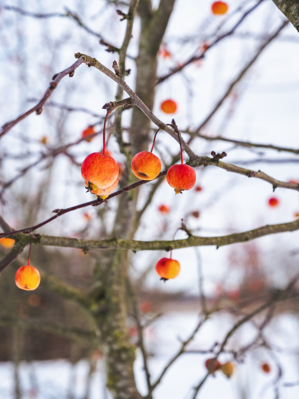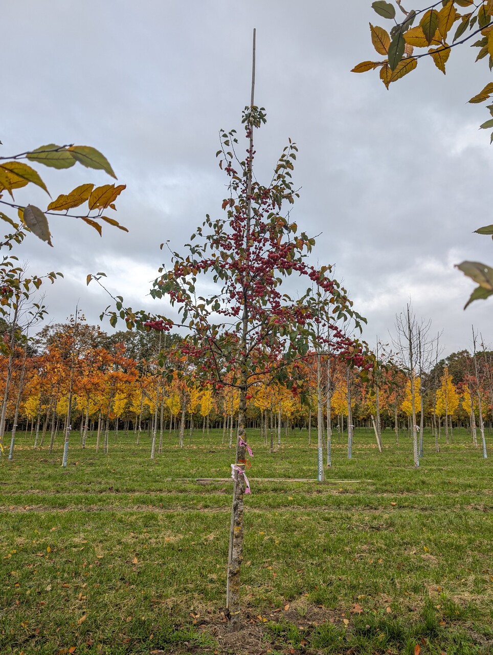 Small tree with a pyramidal crown that later broadens out. The branches spread wide, becoming somewhat pendulous later. The twigs and bark are hairless and dark brown. The slightly lobed and dark green leaves remain in the tree for a long time in the autumn, turning to yellowish-orange. The flowers, almost 6 cm in size, grow in bundles of 4 to 8 together. In the bud the flowers are dark purplish-pink but they turn bright white when open. 'Evereste' produces abundant orange-red to red fruits with a diameter of up to 2.5 cm that remain hanging in the tree until far into the winter. Can be used in gardens, parks and public gardens, but only in verges as a street tree. The tree grows best in nutritious, not too dry soil. Free of mildew and scab. Allowing a solitary planted shrub to grow into a multi-trunked tree can produce an attractive effect.
