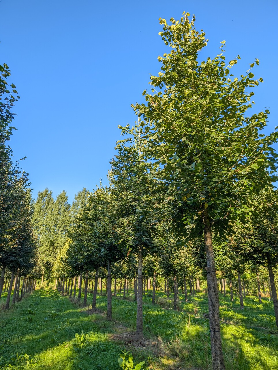 Very probably a hybrid between T. cordata and the rare T. dasystyla from the Crimean. Develops an oval crown with a vertical trunk on which pendulous branches grow. This makes good pruning necessary to guide the tree in its youth. The bark remains thin for a long time, and later develops deep grooves. The leaves have a slanted heart-shaped base and a short, tapered top. The leaf stem is often tinted red and the edge of the leaves is finely serrated. The leaves are light green on the underside. The aromatic flowers appear in pendulous umbels and have particularly abundant honey. 'Euchlora' is one of the best trees for bees. The bract is approx. 6.5 cm long. Owing to its lovely leaves and abundant flowers, 'Euchlora' is a very popular avenue and street tree. A big advantage is that it is not very prone to aphid infestation.