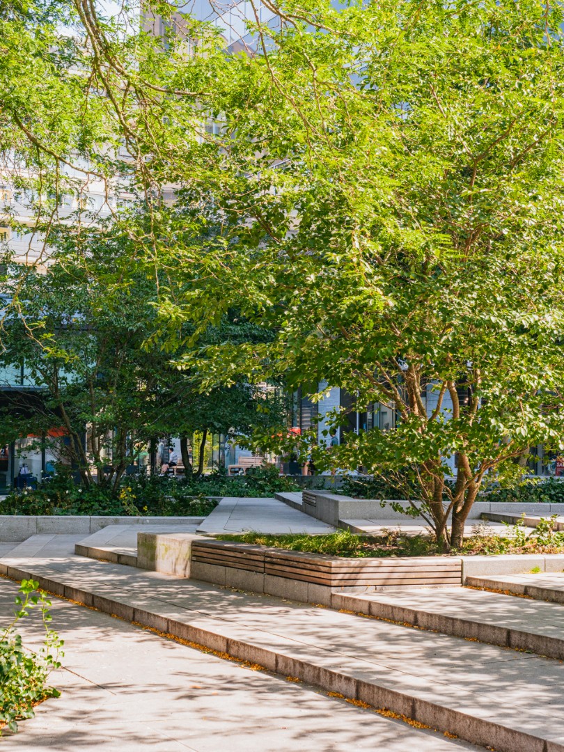 At other locations in the city center, additional species were used, including Tilia, Sorbus 'Dodong', Cornus mas, Robinia, and Acer saccharinum. The mix of species creates a varied urban green structure that is also climate-resilient in the long term and helps reduce heat stress and improve water infiltration.