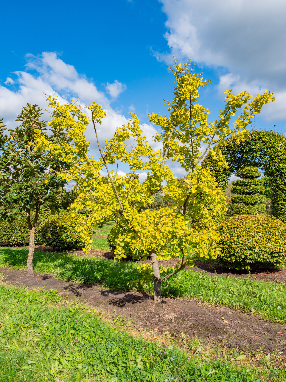 The leaves of Ginkgo biloba 'Tremonia' turn yellow in autumn.
