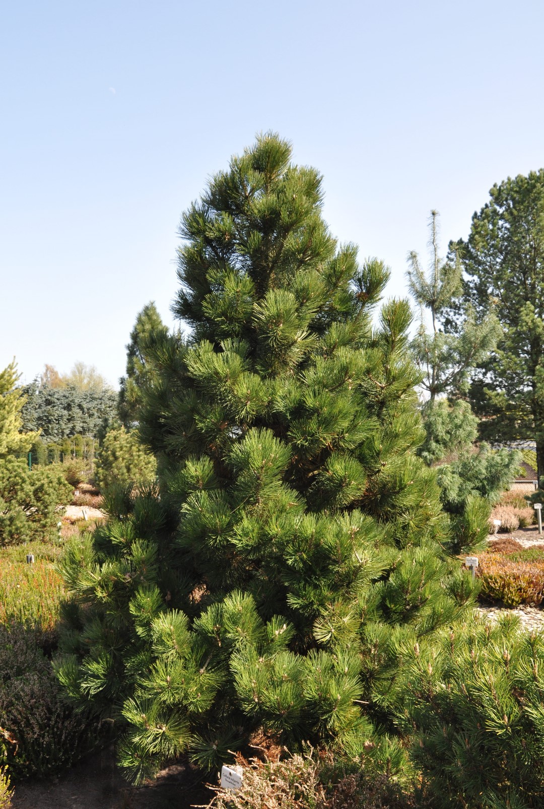 Lovely, densely branched tree growing to around 6 m. The compact crown is ovoid to narrow oval and stays slender and dense when mature. The thick, mature bark is grey-brown and deeply grooved revealing the light brown-yellow bast. The tips of the stiff, glossy, dark green needles are curved inwards which is particularly striking on young shoots. The oval to narrow oval cones are in twos or threes on short stems. Colour is the same as the species. Beautiful and above all compactly growing, quite slender form that is suitable for gardens too. Has few demands as to soil, tolerates limy soil and wind.
