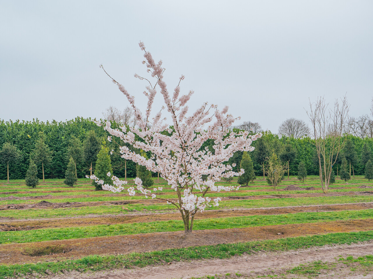 Prunus x yedoensis is a medium-sized tree that attains a height of 6 - 10 m. The crown is board vase-shaped and the ends of the branches are pendulous so that the crown eventually becomes flattened. The wide oval leaves are 6 - 12 cm long. Emerging leaves are very light green. The autumn colour is yellow. Abundant flowers in April. The flowers are pale pink in the bud and emerge white. They have a slight almond scent. Flower diameter approx. 3.5 cm. Black drupes in the late summer. Winter hardiness zone: 6a
