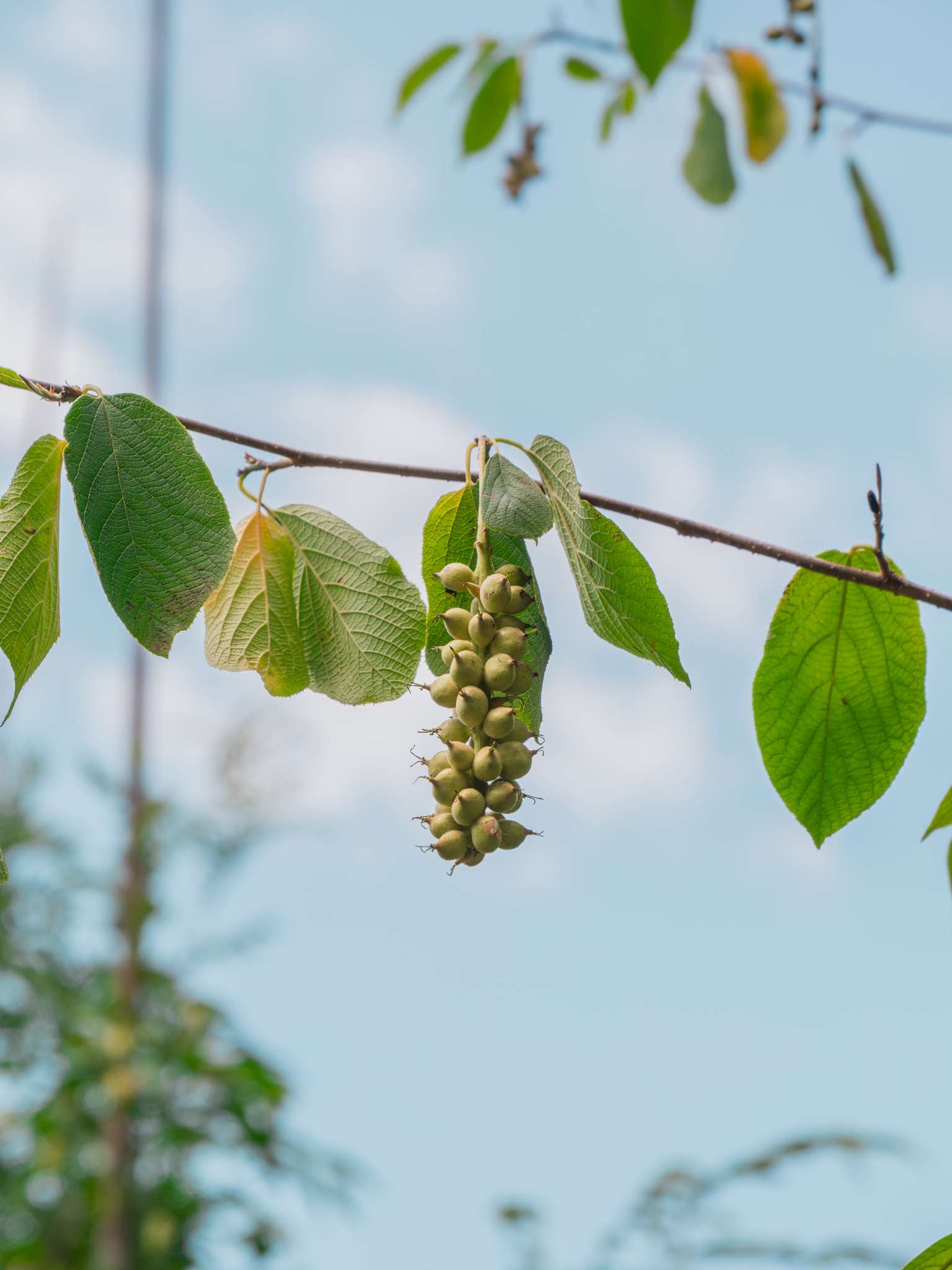 Sinowilsonia henryi is a large shrub to small, often multi-stemmed tree 5-8 m tall. The crown is round and the tree is somewhat reminiscent of Tilia from a distance. Both twigs and leaves are covered with felty hairs that make them soft to the touch. The fairly large leaves betray Sinowilsonia's kinship with Hamamelis. The flowers are clearly less spectacular. Sinowilsonia produces green, unisexual flowers that open around April-May but are not very conspicuous. The male flowers appear in 3-5 cm long catkins, while the female flowers appear in shorter clusters. When these develop into brown fruits, they can reach 15 cm in length.