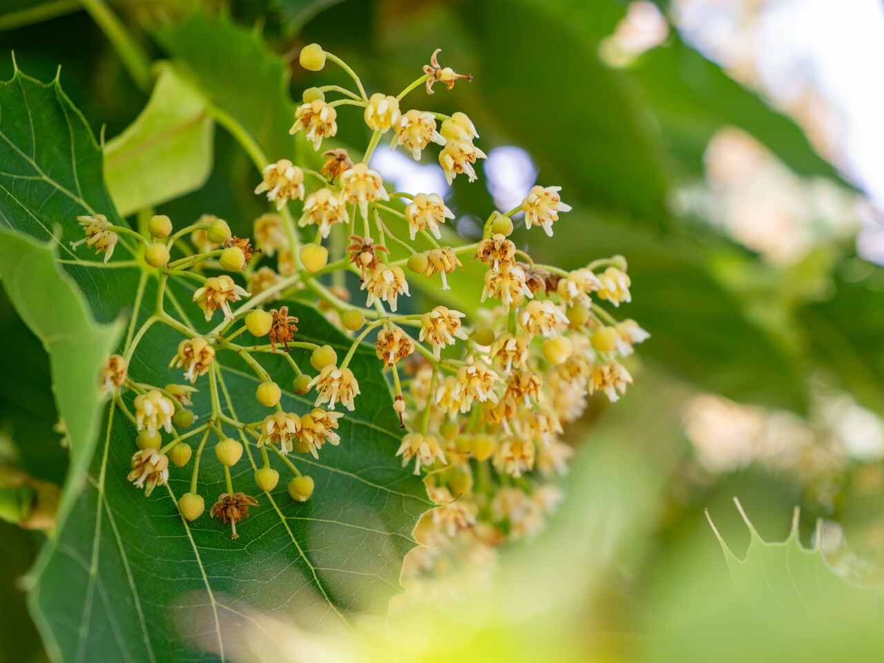 Naturally growing in central China where it grows from a shrub into an impressive tree up to 25 m high. Due to its sensitivity to frost, it is rarely cultivated in Europe and grows to a maximum height there of 15 m. T. henryana has particularly decorative leaves that are pink to a dark bronze colour when they emerge. They are covered thickly with silver-coloured, star-patterned hair and turn shiny dark green later in the season. Underneath, they are covered with downy brown hair. The leaf tapers shortly at the top and the edge is serrated with needle-shaped teeth that are developed by the lateral veins extending into the teeth. The lovely-smelling yellowish white flowers grow in pendulous umbels of 20 to 50 together. The bract has a long stem and is approx.13 cm long. T. henryana requires a warm, sheltered site.